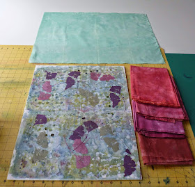 When I was going through my fabric stash looking for likely victims candidates for the self round robin, I came along this old piece which was a "failed" deconstructed silk screen on linen. The fabric was so scrumptious and the pale colors so appealing That I had hung on to it thinking there might be a place for it in my life one day.