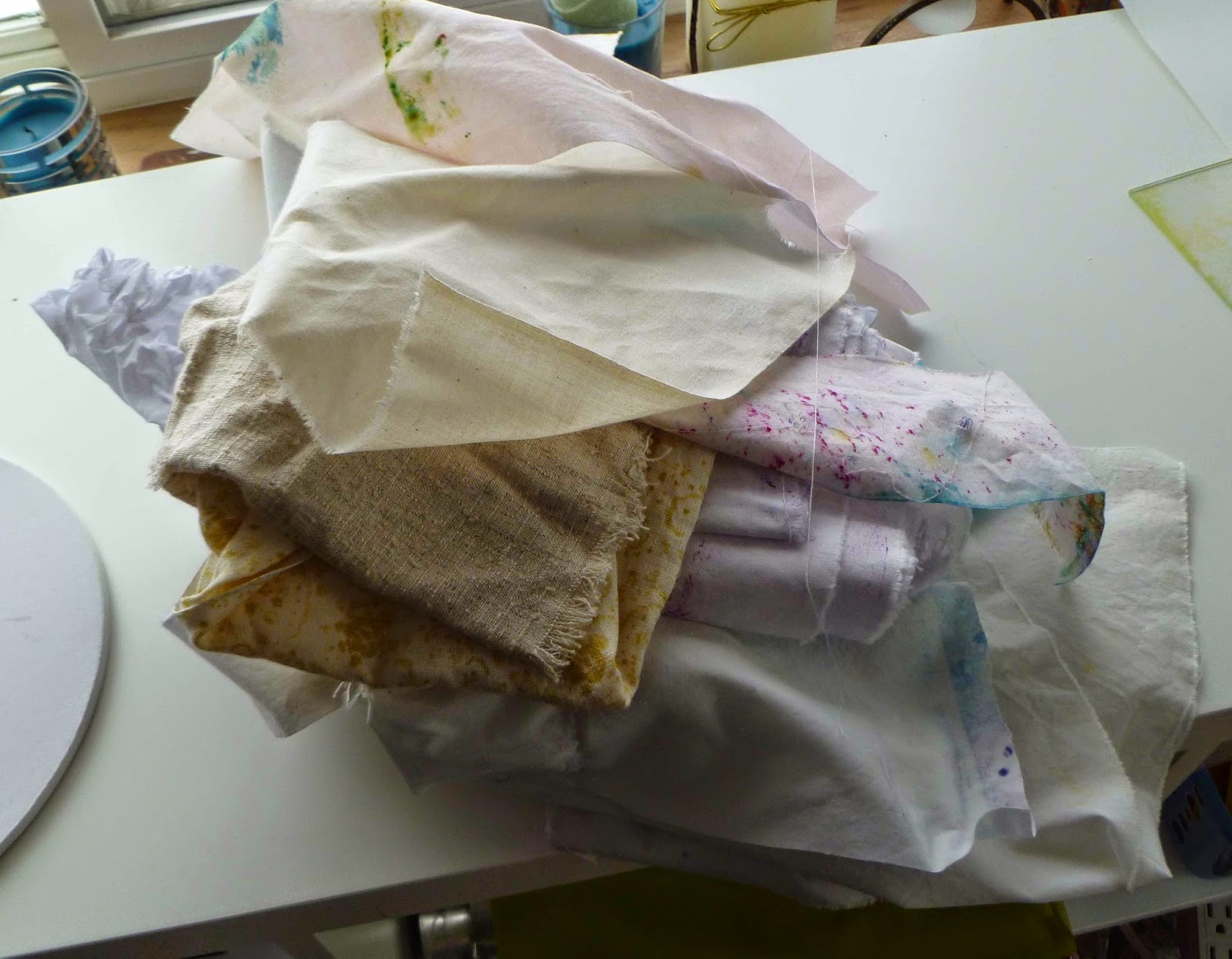 You know how when you do a deconstructed screen or any screen printing , you invariably end up with a good chunk of white cloth on the ends like leftovers. I cut them off and I saved them. Today with all the snow, I thought I would snow dye them. These are definitely the best snow dyes I've done in years and on tiny bits! Isn't that always the way?